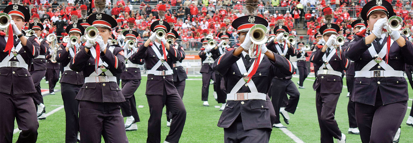 Ohio State University’s (OSU) football games are exciting. But its marching band steals the show at halftime. You might see Superman stop a speeding train or a T. rex cross the 50-yard line. Marching band members crisscross the field to make these designs. And they do it all while playing their instruments!