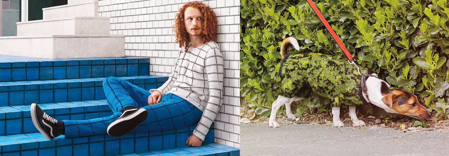 The bus-inspired sweater caught photographer Joseph Ford’s attention. They decided to team up: Ford would take the pictures, and Dodd would knit the clothing to match the background. Then they would take photographs of models wearing the clothes at the same site as the original image.