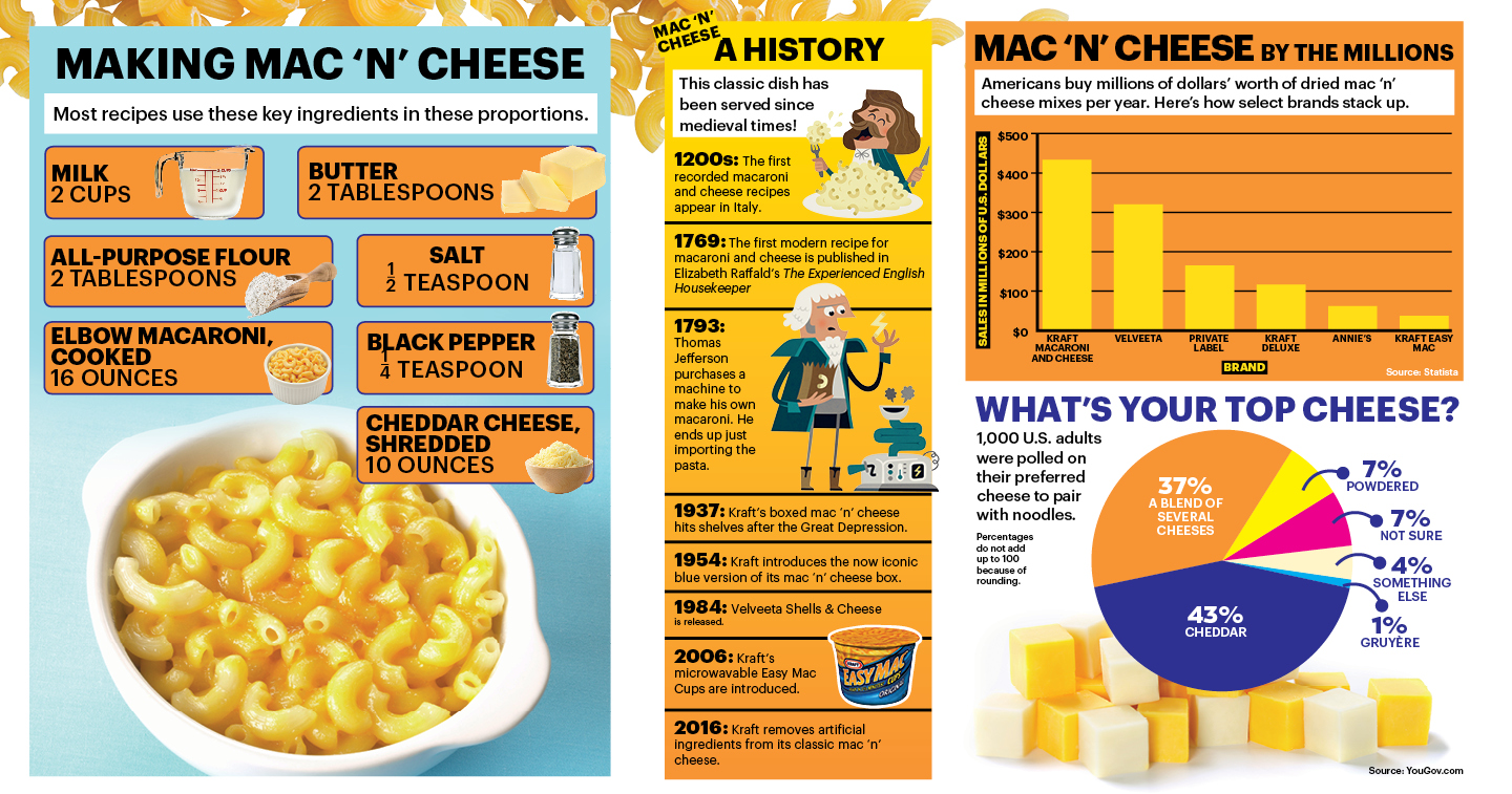 Jefferson brought his favorites back to America. That included recipes for pasta and a large machine to crank out noodles so he could serve fresh mac ’n’ cheese to his friends and family. As president, he even put the dish on the menu at an official state dinner in 1802!