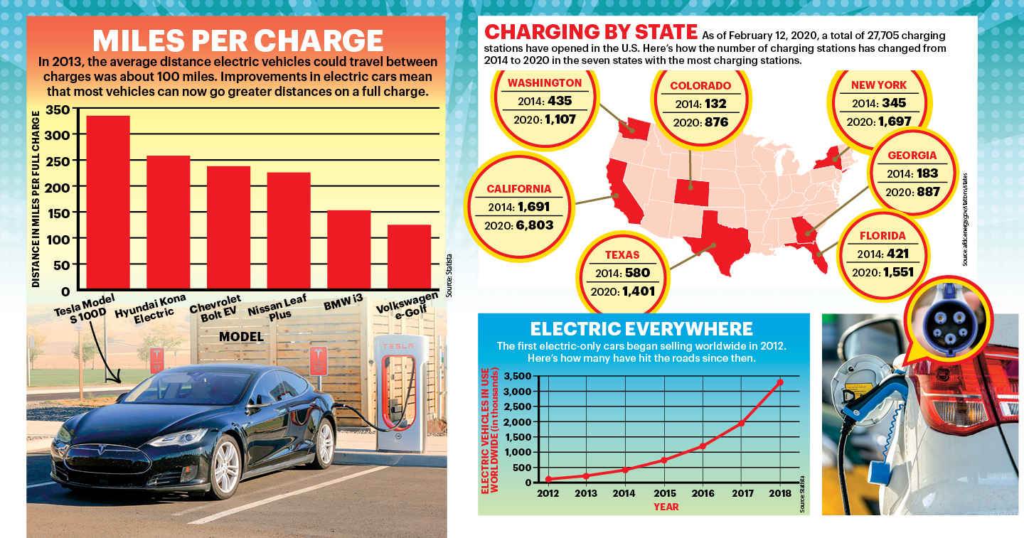 From cars to buses to trucks, vehicles are becoming electric. Instead of burning gasoline, they run on batteries. To fuel up an electric car, you plug it into a special electrical outlet. Mass production of electric cars began in 2010. Since then, new models have taken the U.S. by storm—and are offering a more environmentally friendly alternative to gas-burning cars.