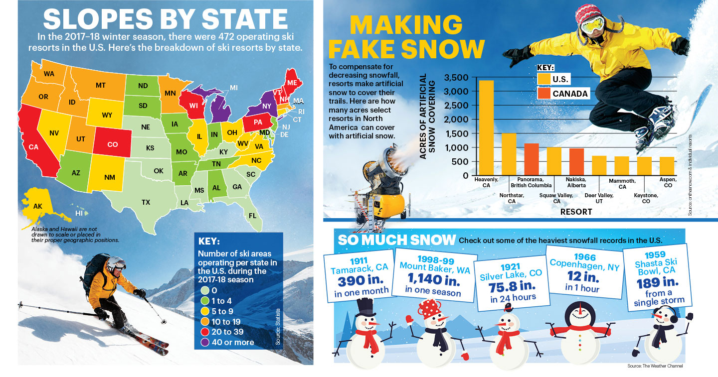 Jim McMahon/Mapman ® (map); Poncho/Getty Images (skiier); Shutterstock.com (snow machine); yulkapopkova/E+/Getty Images (snowboarder); iStockPhoto/Getty Images (snowmen, snow)